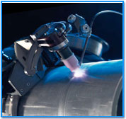 El cabezal de soldadura esta provisto de todas las funciones que pueden ser usadas en varios procesos y diseńos de bisel. Adaptado perfectamente par ala unión de tubos y tendidos de tubería de de espesor de pared medio a alto de todos los materiales soldables. El cabezal de soldadura viaja alrededor del tubo sobre una banda de acero previamente montado.